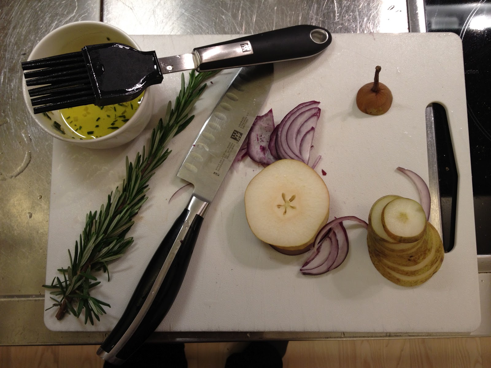 Place the rieska on a pizza stone, or place on a parchment paper. Brush the olive oil mixture over the top of the rieska. Top with the pear, red onion and then blue cheese sprinkled over the top. Toss a few fresh rosemary leaves over the top and place in the oven. (the parchment paper can be placed directly onto the wire oven rack. Bake 8-10 minutes or until slightly golden brown. Serve immediately.